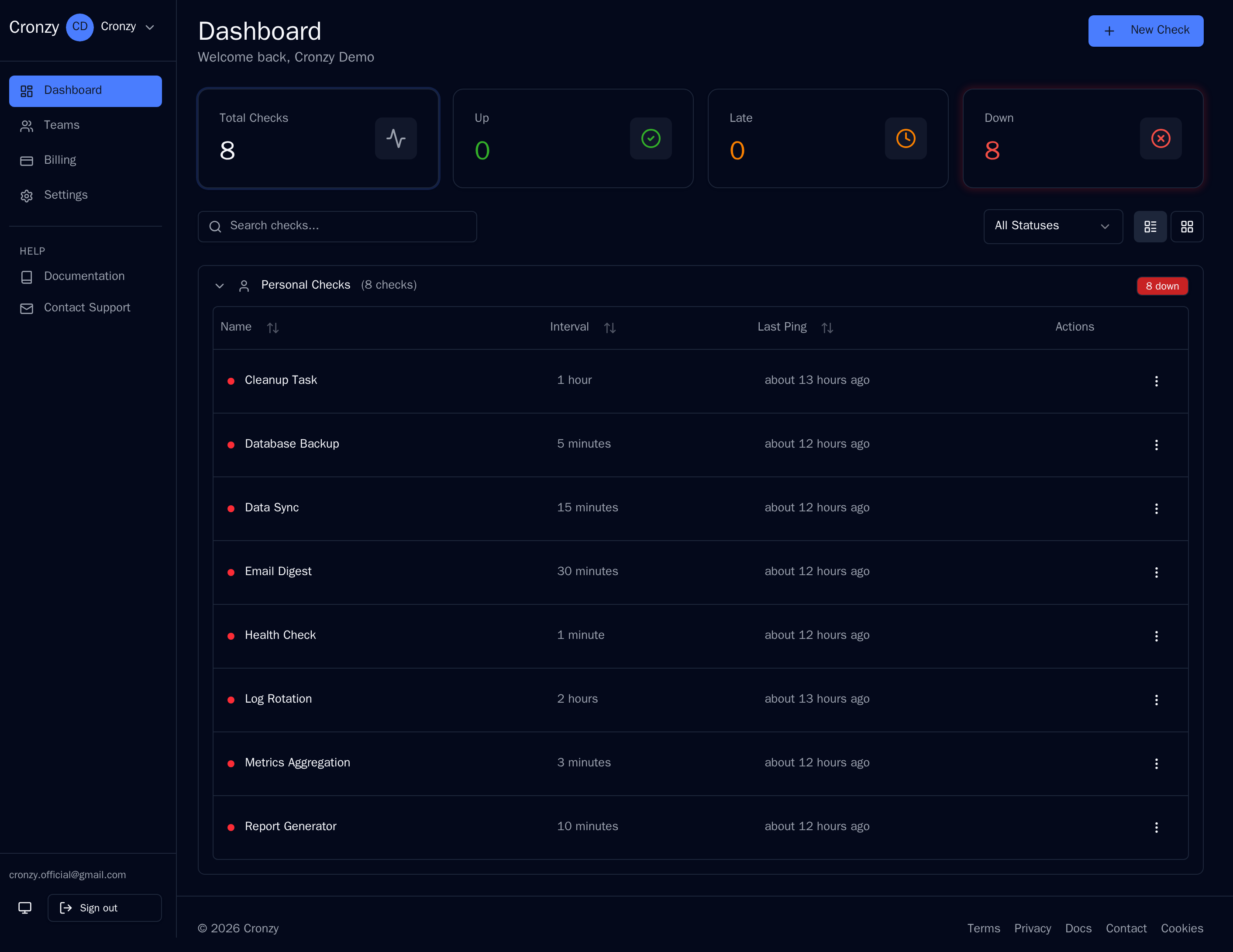 curl -fsS https://api.cronzy.io/ping/YOUR_CHECK_UUIDPing this URL when your job completes. We alert you if we don't hear from it.